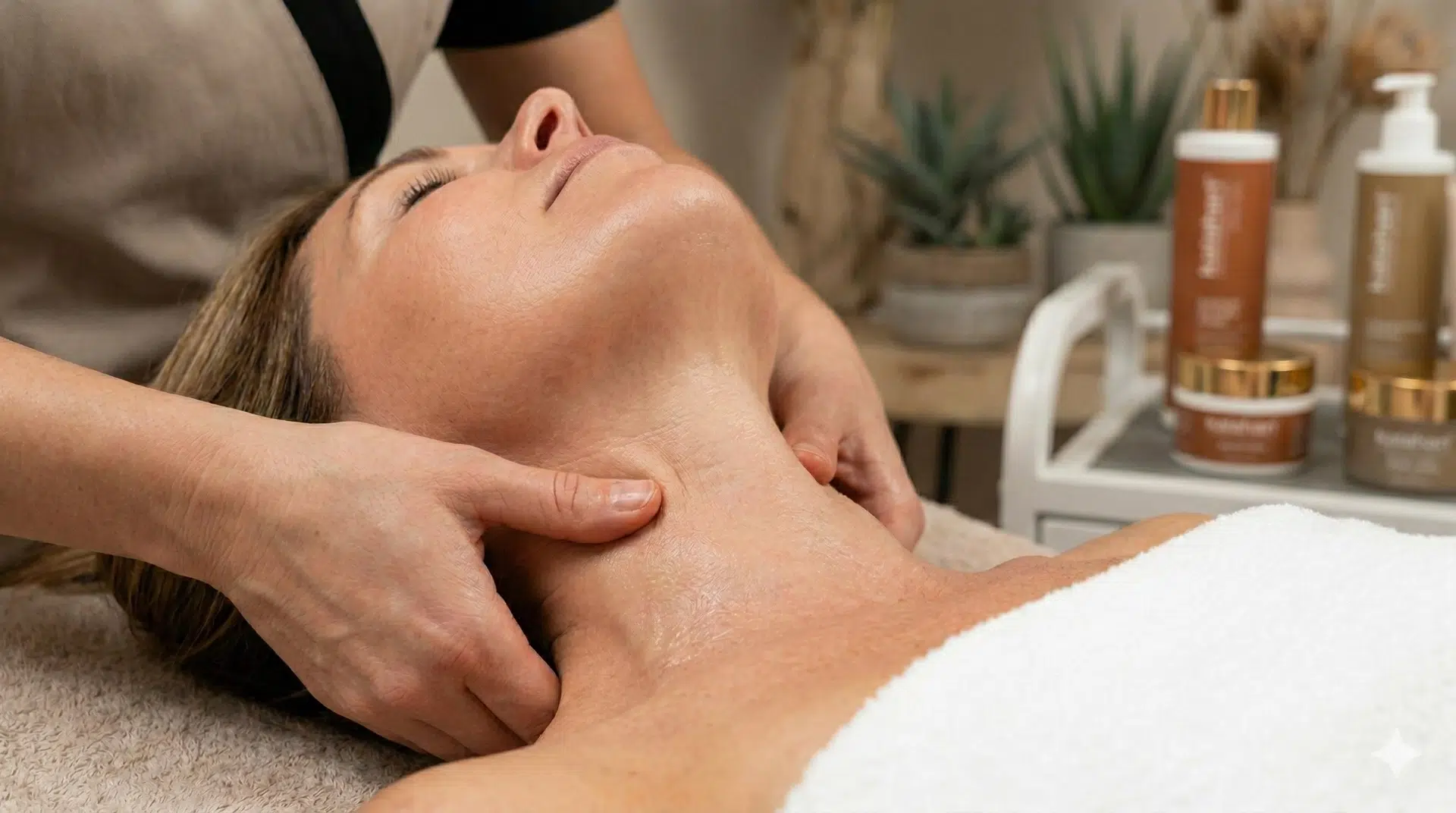 De Kalahari Neck Treatment richt zich specifiek op dit gebied — met actieve verzorging en bindweefselmassage voor verstrakking en een zichtbaar verbeterde huidconditie.